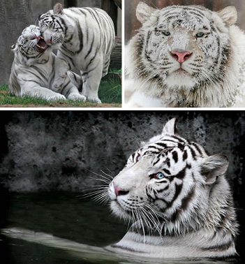 白虎和其他老虎可能種屬相同,但是由于隱性基因的原因,它們卻沒(méi)有普通老虎所擁有的橙色皮毛,只有一身黑白相間的外衣。維雅切斯拉夫希望向人們展示這些白虎人性化的一面。他為左上圖題寫(xiě)的圖注是,“媽媽?zhuān)灰鷼??!边@種黑白相間的大型貓科動(dòng)物,它們最迷人的地方就是粉紅色的鼻子和藍色的眼睛。右上圖的這只白虎正趴在雪地里,滿(mǎn)臉是雪粉。下圖的這只白虎似乎正在水中洗澡。