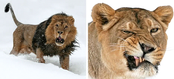 獅子是體形最大的非洲貓科動(dòng)物。在所有貓科動(dòng)物中,它們身材最高,體重僅次于老虎,位居第二。左圖這只雄獅正在雪地里咆哮,它看起來(lái)似乎有點(diǎn)兒暴躁。只有真正的大型貓科動(dòng)物才擁有咆哮的功能。維雅切斯拉夫解釋說(shuō),右圖的這只雌獅似乎對客人的打擾頗不耐煩,好象是在冷笑。