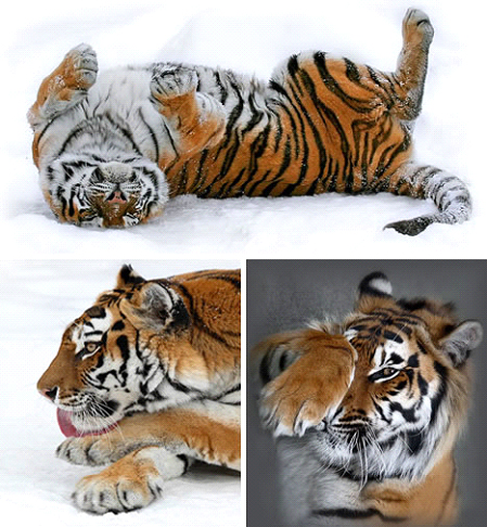 2010年是中國的虎年。但是,世界上目前只剩下大約3200只老虎。老虎是最強大、最雄壯的亞洲貓科動(dòng)物之一。上圖中的老虎正躺在雪地里自?shī)首詷?lè ),左下圖的老虎正在舔自己的虎爪。右下圖的那只老虎似乎很害羞,在和攝影師維雅切斯拉夫玩躲躲貓的游戲。維雅切斯拉夫介紹說(shuō),“我本來(lái)是想展示這種獸中之王美麗而優(yōu)雅的一面?!?nbsp;